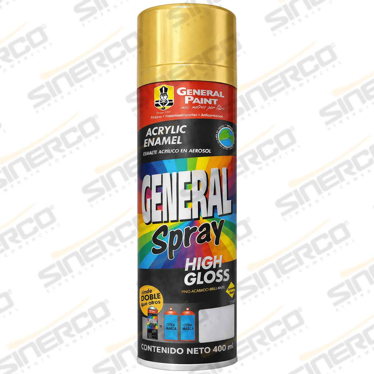 La pintura metálica en aerosol Metálicos de General Paint (General Spray High Gloss) es un recubrimiento de secado rápido diseñado para decorar y proteger superficies, logrando un efecto metálico en tonos como cromo, aluminio, oro y colores metálicos
