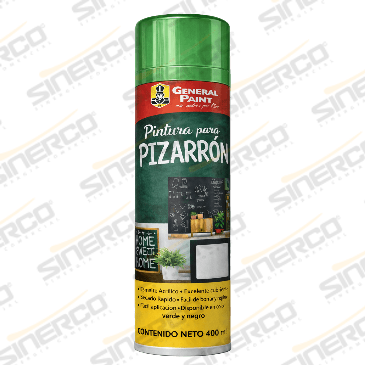 La pintura para pizarrón en aerosol General Spray es un esmalte alquidálico de secado rápido (resina alquidálica modificada) con alta concentración de pigmentos, diseñado para crear una superficie de acabado mate que facilita el uso del gis y permite borrar y repintar con facilidad